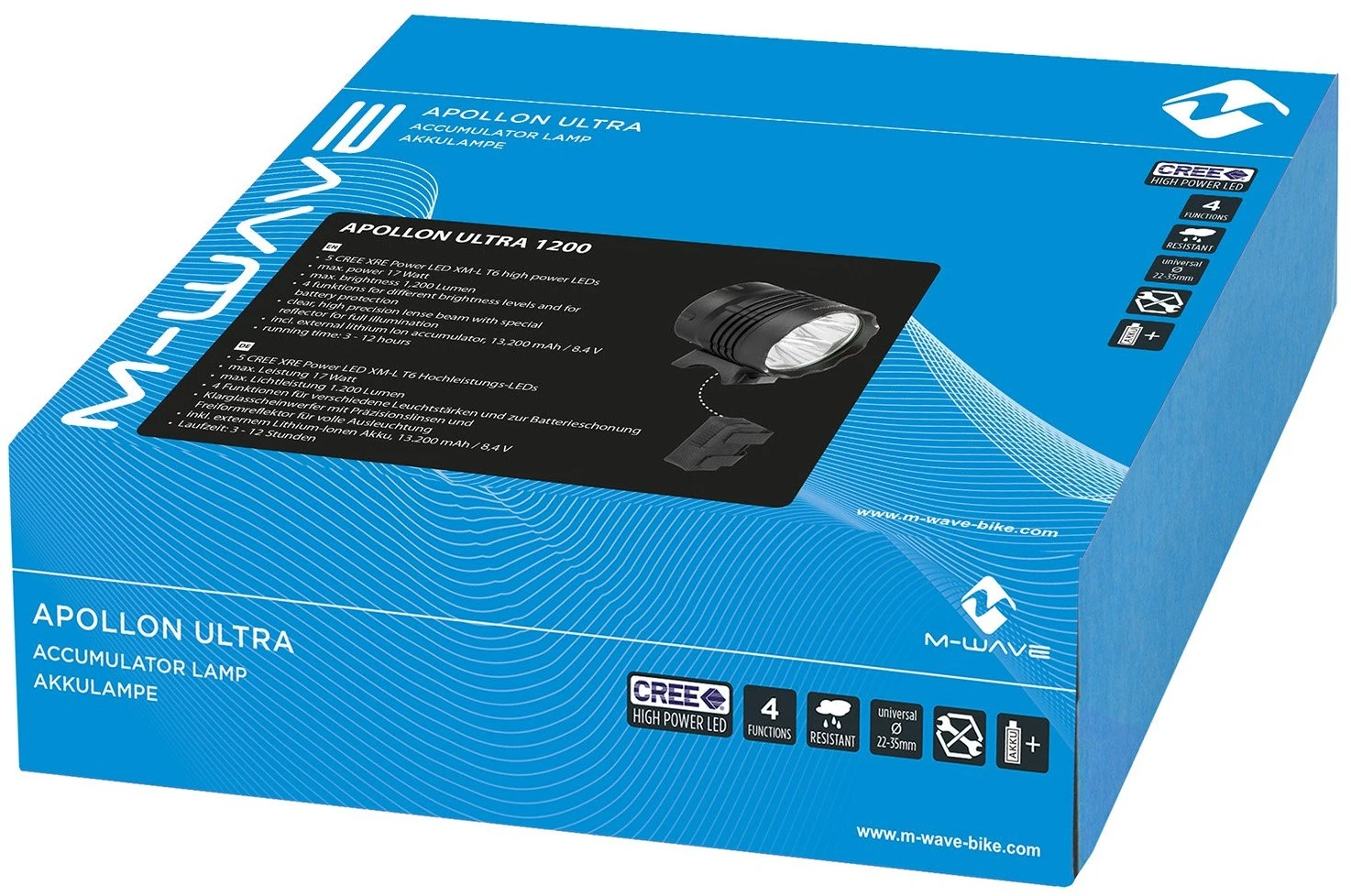 batterylamp M-WAVE, 1200 lumen, w/bracket for handlebar, w/ o’rings, w/strap for head/helmet, w/o approval no., w/rechargable battery & charging cable